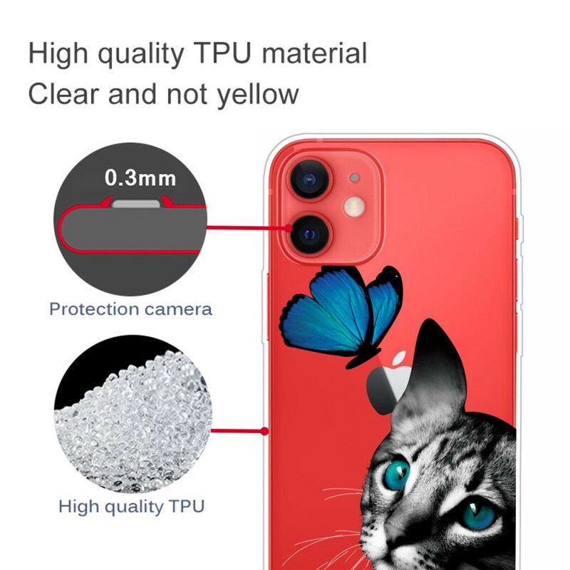 Pokrowiec na iPhone'a 13 Mini o artystycznym wyglądzie z kotem i motylem, który doskonale go zabezpiecza.
