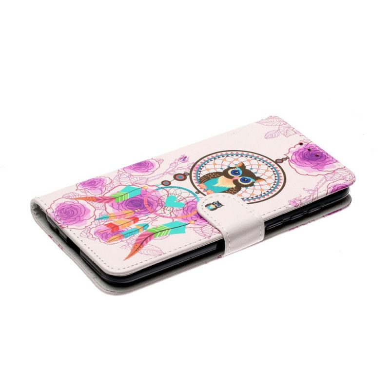 Skórzana osłona z doskonałym efektem dla Huawei Y5p w kształcie łapacza snów z życzliwą sową.
