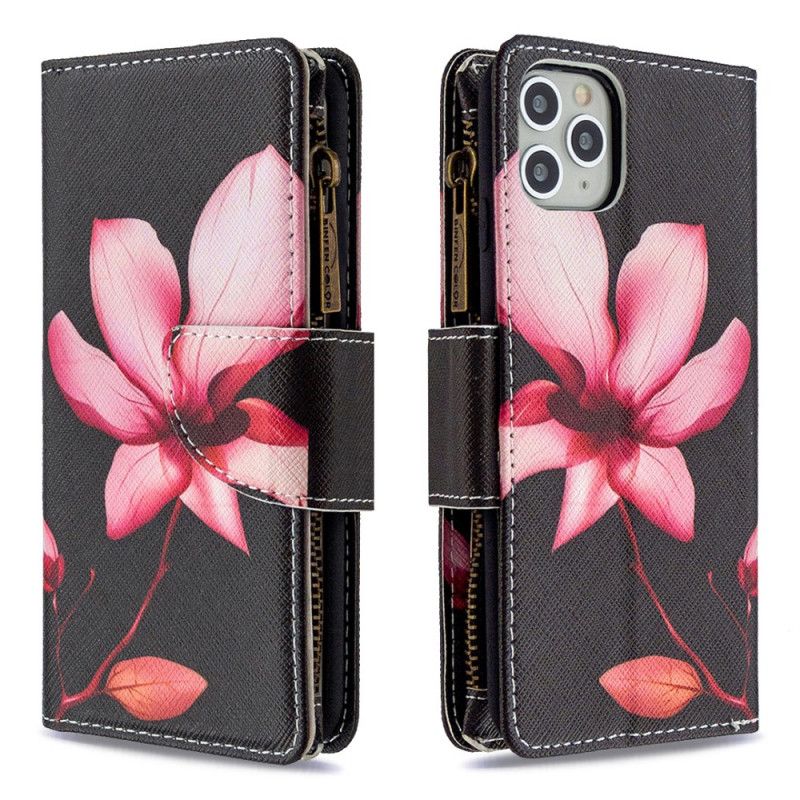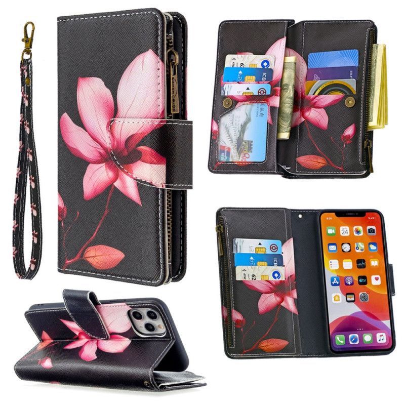 Etui Folio iPhone 11 Pro Max Biały Czarny Kieszeń Zapinana Na Zamek W Kwiaty Etui Ochronne