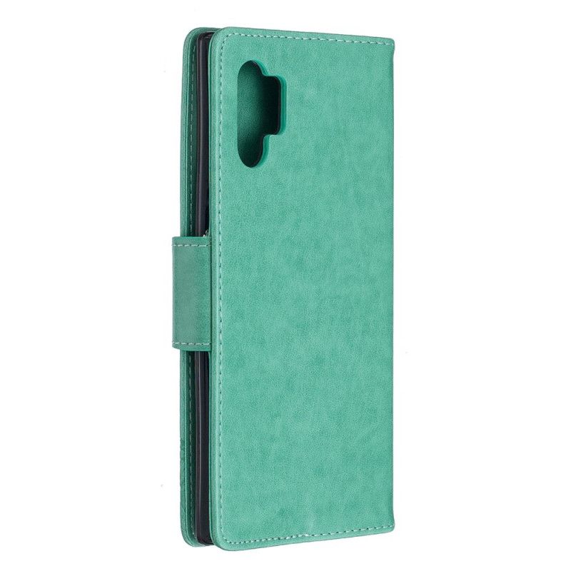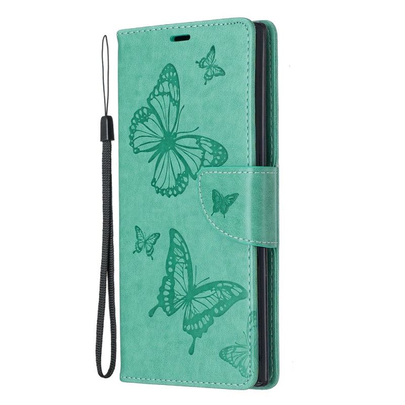 Ten telefon Samsung Galaxy Note 10 Plus jest chroniony portfelem dzięki temu etui ze sztucznej skóry ozdobionym piękne motyle, do którego dołączony jest odpinany pasek.
