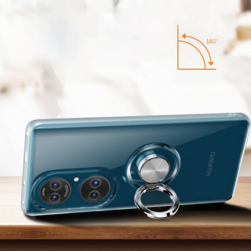 Proste przezroczyste etui z metalowym pierścieniem podtrzymującym chroni Huawei P50 podczas noszenia go na palcu.