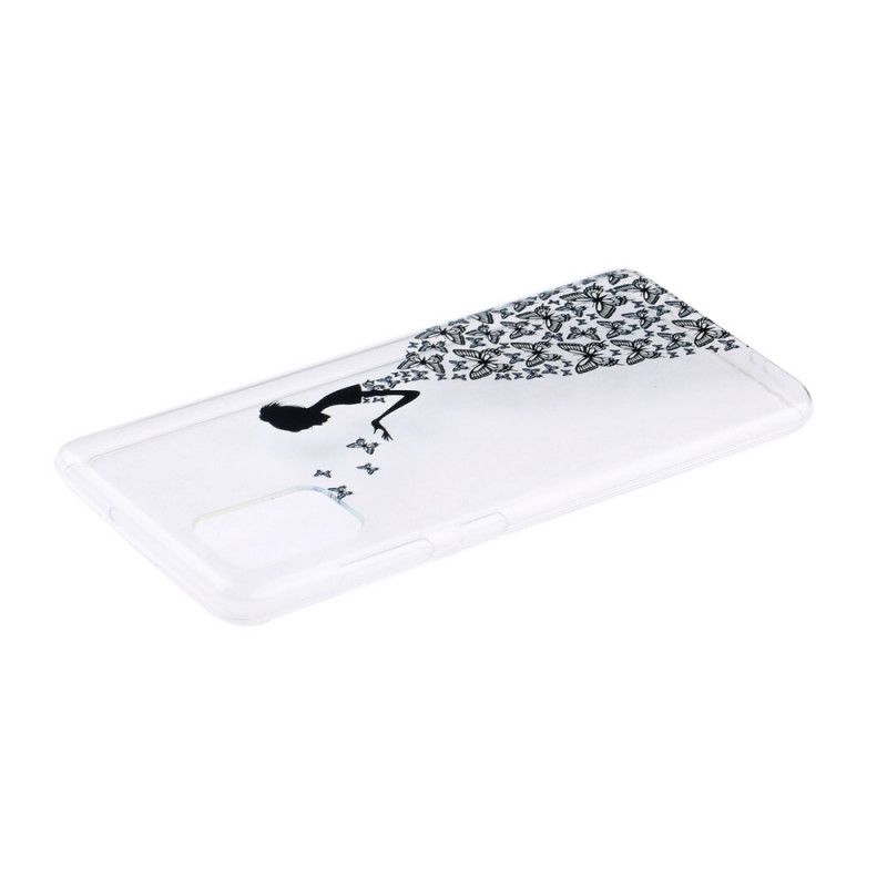 Przezroczysta skorupa ozdobiona kobietą w sukience motyla, która wtapia się w delikatne kształty telefonu Huawei Y5p.