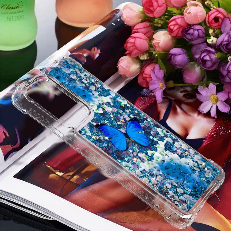 To Wspaniałe Błyszczące Etui Z Niebieskimi Motylkami I Sznurkiem Zapewni Wyjątkową Ochronę Twojego Samsunga Galaxy A53 5G.