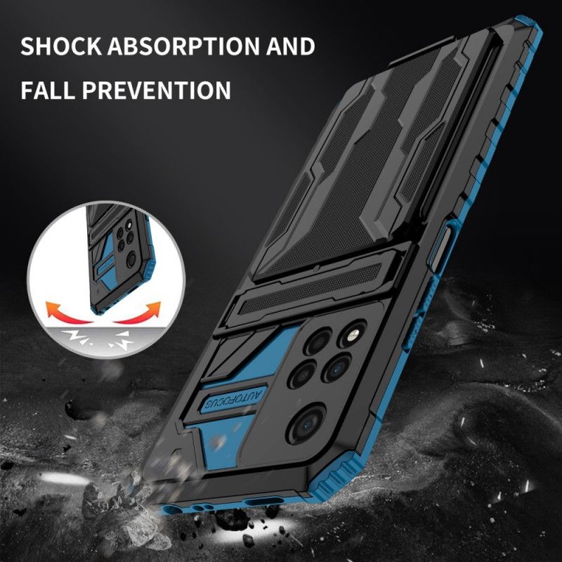 Odkryj to hybrydowe etui na telefon Xiaomi Redmi Note 11 Pro / Note 11 Pro Plus, które jest wyposażone w zapinany na zamek uchwyt na kartę i podstawkę.