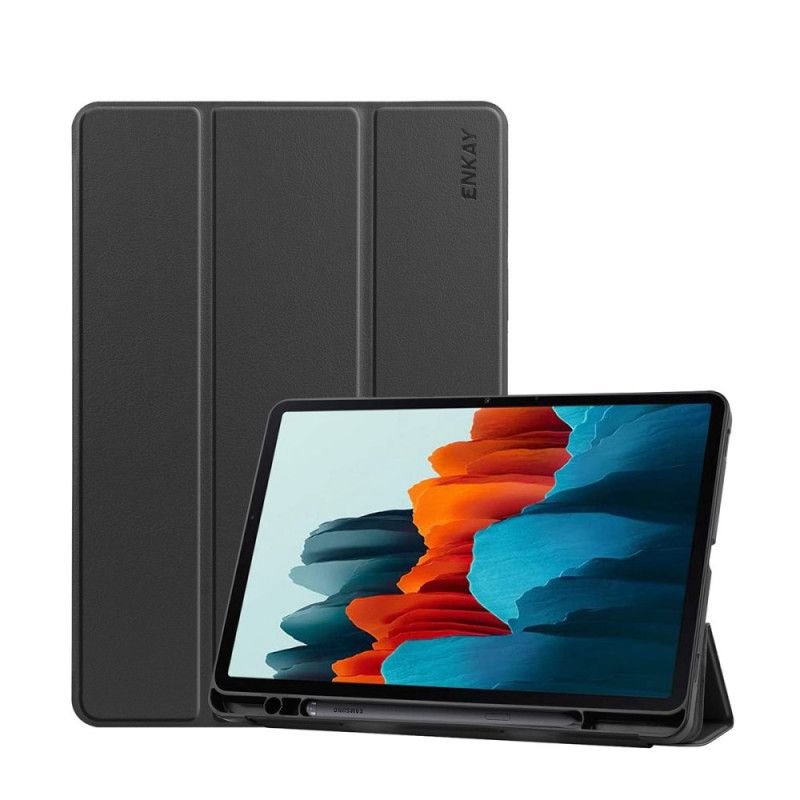 Eleganckie etui z imitacji skóry z uchwytem na ołówek firmy ENKAY skutecznie i wielofunkcyjnie zabezpiecza Samsung Galaxy Tab S7.