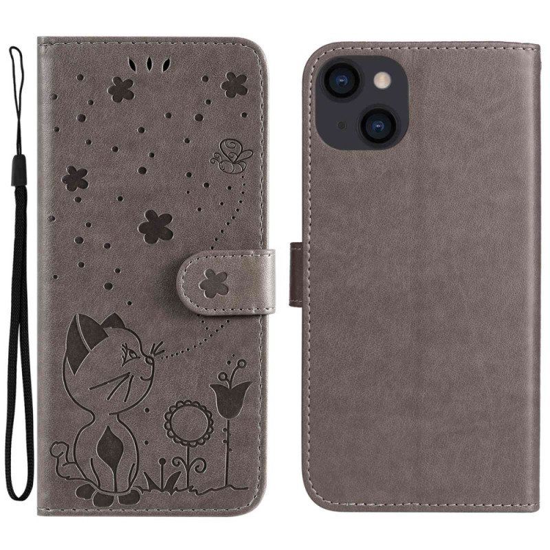 Skórzany Futerał do iPhone 14 Plus z Łańcuch Kot I Pszczoła Z Smyczą