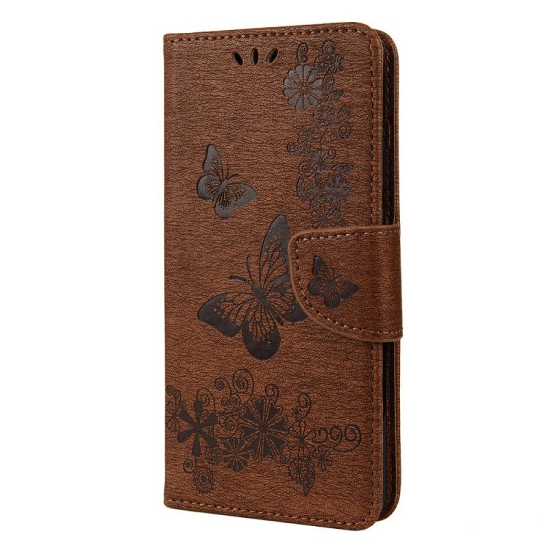Skórzany Futerał Huawei Y6p Szary Czarny Etui na Telefon Tylko Motyle Ze Stringami
